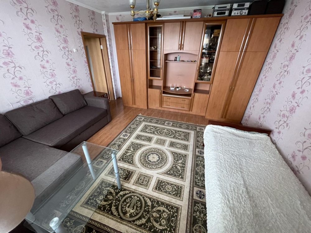 При продаже остается кухонный гарнитур с электроплитой, холодильник, стиральная машина, кухонный стол, микроволновая печь, шкафы в комнате и прихожей, диван, тумбочка.